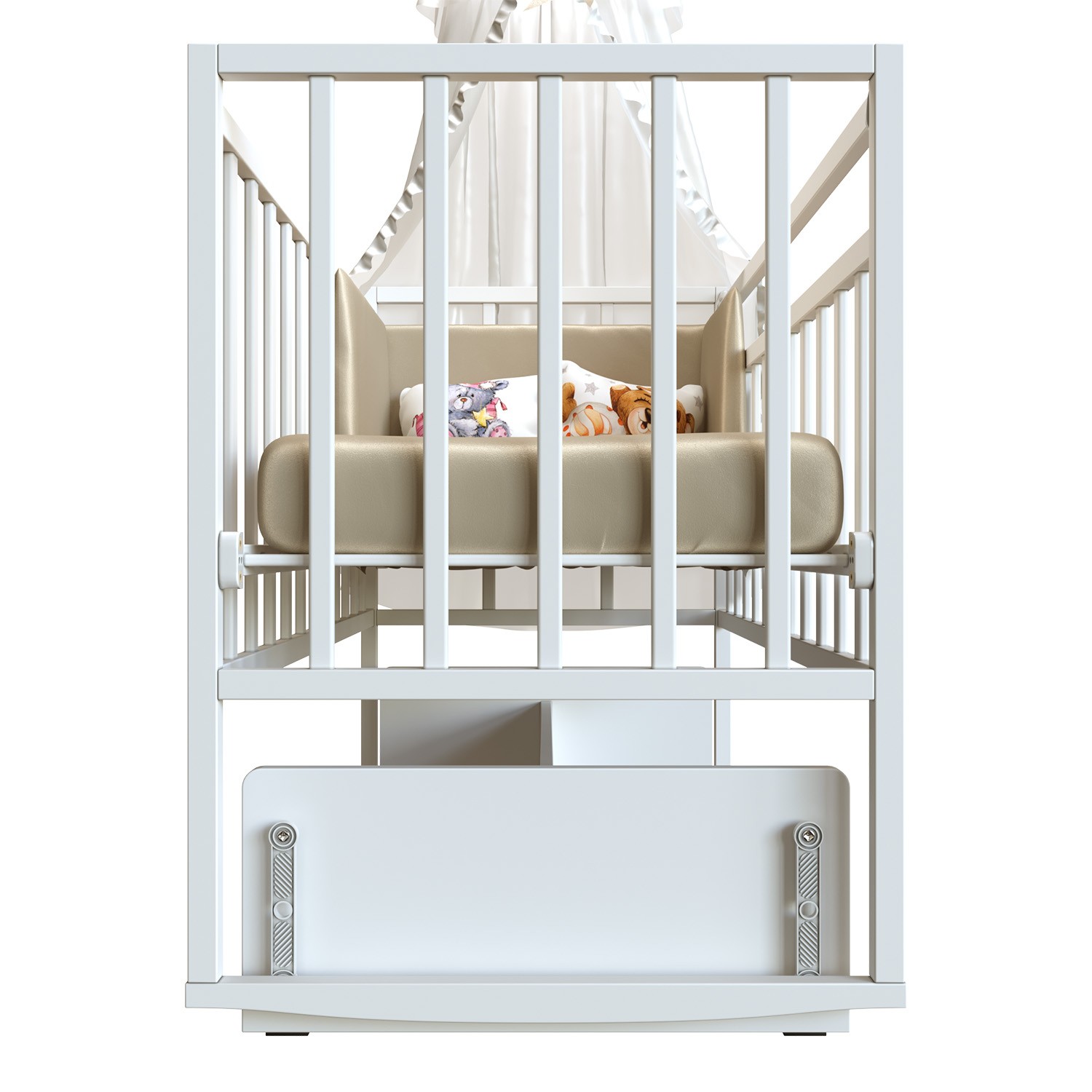 Вы будете довольны маятником поперечного качания в модели MAGICO-MINI 3. Достаточно легкого усилия, чтобы кроватка совершала многократные колебательные движение. Механизм работает бесшумно, плавно и радует не только малыша, но и родителей. Откидывающаяся вниз планка передней боковой стенки и два возможных уровня установки дна обеспечивают достойный уровень комфорта и безопасности.