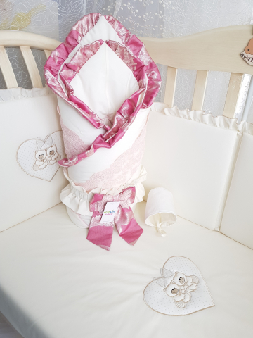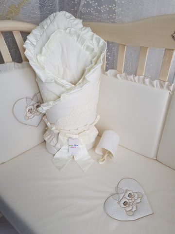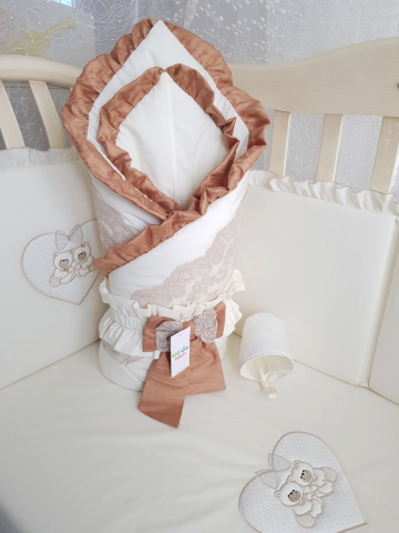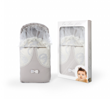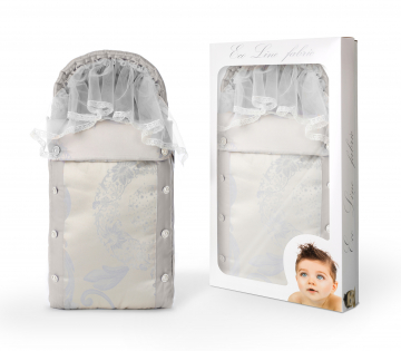 Конверт на выписку Eco Line Винтаж украшен воздушными рюшами и аккуратным бантиком. Изделие имеет форму уютного кокона, обеспечивает малышу тепло и комфорт. Большой капюшон можно стянуть или расслабить. Изделие сделано из хлопкового сатина, дополнено сеточкой от насекомых.
