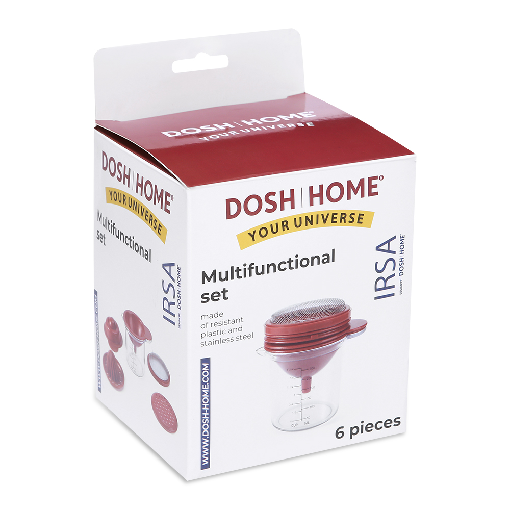 Универсальный набор для приготовления кулинарных изысков, используется для выпечки и приготовления различных блюд, напитков, кремов: мерный стакан 300 мл и 5 различных насадок: отделитель яичного белка, сито с мелким плетением, универсальная воронка, соковыжималка для цитрусовых, терка для цедры. Изготовлено из прочного качественного пластика и нержавеющей стали. Можно мыть в посудомоечной машине.