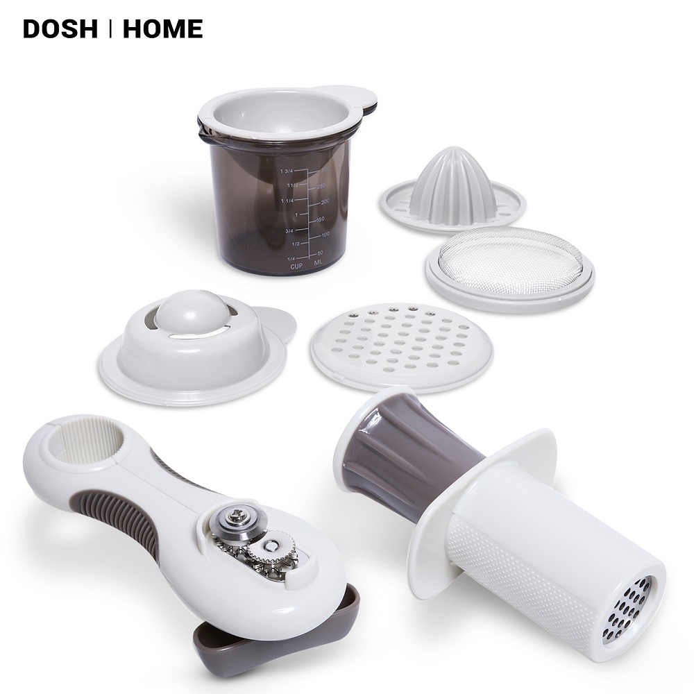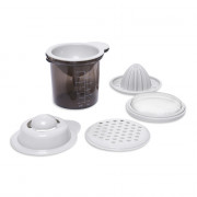 Универсальный мерный стакан 300 мл и 5 различных насадок: отделитель яичного белка, сито с мелким плетением, универсальная воронка, соковыжималка для цитрусовых, терка для цедры.