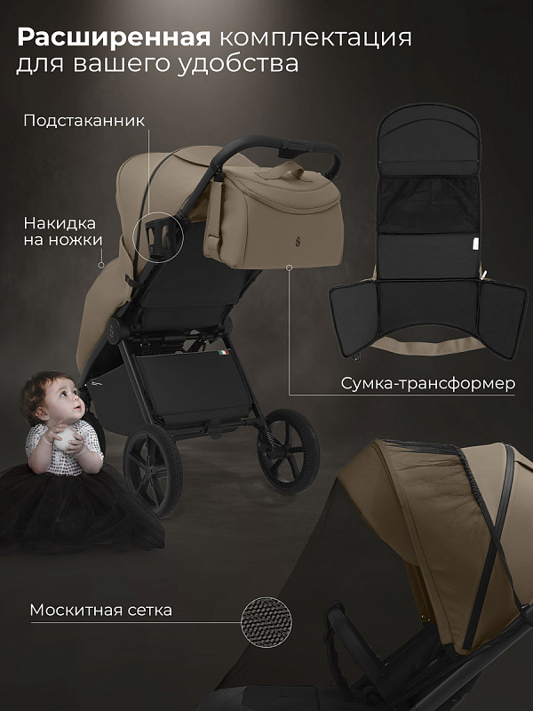 - В комплекте все необходимое: москитная сетка, накидка на ножки, подстаканник, сумка для мамы.