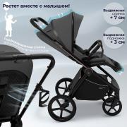 • Регулируемая спинка и подножка расположены вместе с ребёнком, глубоким бесшумным капюшоном с раскладкой до бампера, защищающим от ветра и солнца.
