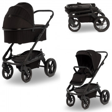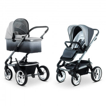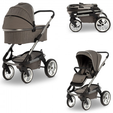 Прочное и лёгкое универсальное шасси сделано из алюминия. На раму реверсивно устанавливаются все модули бренда. Конструкцию можно компактно сложить, её удобно переносить и хранить в квартире или багажнике машины. Надувные каучуковые колёса устойчивы к проколам и износу. Передние поворотные колёса можно фиксировать при необходимости. Родительская ручка обтянута мягкой экокожей, регулируется по высоте. Модель дополнена большой багажной корзиной для вещей малыша и мамы.