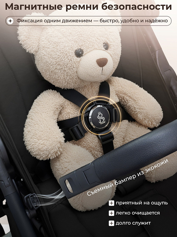 Широкое и удобное сиденье удобно носить с ребенком даже в комбинезоне. Магнитные ремни безопасности включают удобства родителей. Большое спальное место позволит малышу чувствовать себя уютно в поезде.